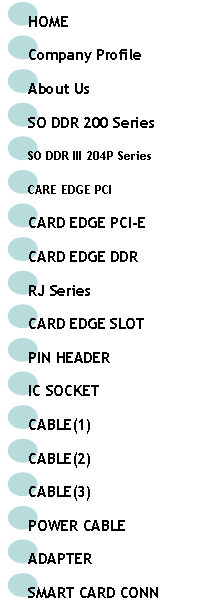 | HOME | SO DDR 200P |SO DDR 204P | PCI | PCI-E | DDR | RJ | SLOT | PIN HEADER | IC SOCKET | SMART CARD | CABLE(1) | CABLE(2) | CABLE(3) | POWER CABLE |ADAPTER | |