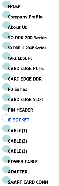 | HOME | SO DDR 200P |SO DDR 204P | PCI | PCI-E | DDR | RJ | SLOT | PIN HEADER | IC SOCKET | SMART CARD | CABLE(1) | CABLE(2) | CABLE(3) | POWER CABLE |ADAPTER | |