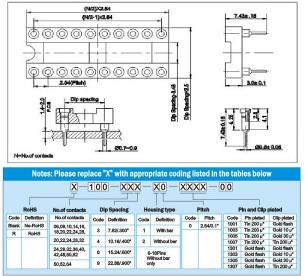 Dual-line IC Socket - with screw machined pins Open Frame - Standard Solder tail tin/gold - standard 4 finger clip contacts |