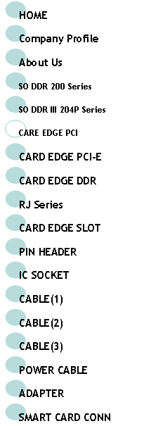 | HOME | SO DDR 200P |SO DDR 204P | PCI | PCI-E | DDR | RJ | SLOT | PIN HEADER | IC SOCKET | SMART CARD | CABLE(1) | CABLE(2) | CABLE(3) | POWER CABLE |ADAPTER | |