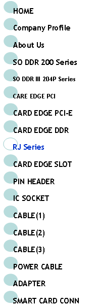 | HOME | SO DDR 200P |SO DDR 204P | PCI | PCI-E | DDR | RJ | SLOT | PIN HEADER | IC SOCKET | SMART CARD | CABLE(1) | CABLE(2) | CABLE(3) | POWER CABLE |ADAPTER | |