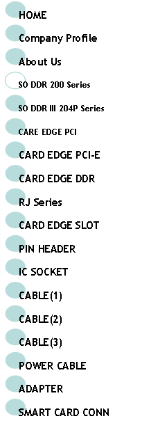| HOME | SO DDR 200P |SO DDR 204P | PCI | PCI-E | DDR | RJ | SLOT | PIN HEADER | IC SOCKET | SMART CARD | CABLE(1) | CABLE(2) | CABLE(3) | POWER CABLE |ADAPTER | |