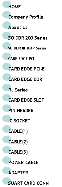 | HOME | SO DDR 200P |SO DDR 204P | PCI | PCI-E | DDR | RJ | SLOT | PIN HEADER | IC SOCKET | SMART CARD | CABLE(1) | CABLE(2) | CABLE(3) | POWER CABLE |ADAPTER | |